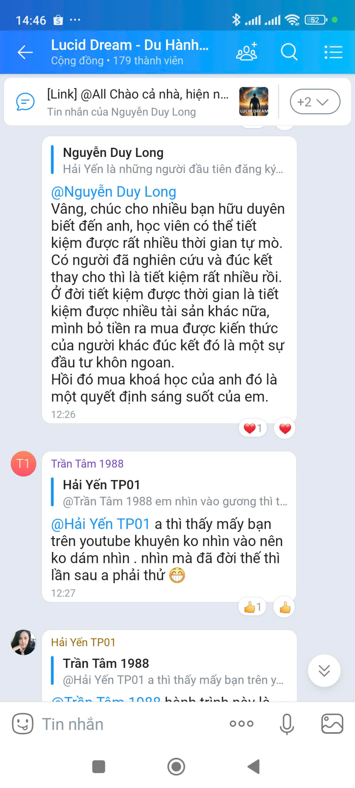 Thầy rất có tâm, chỉ dẫn nhiệt tình ạ. Lucid Dream thật tuyệt, em rất thích vô thế giới đó.